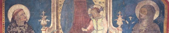 Ai due lati del trono assistono s. Francesco e s. Chiara ed ai suoi piedi i minuscoli ritratti dei confratelli, vestiti di bianco.